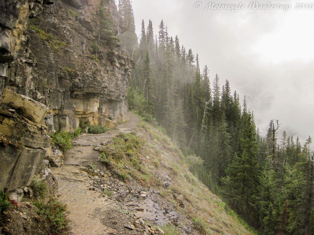 You are climbing up ever higher from the Going to the Sun Road, on this narrow ledge. I spied some bicyclists on the road, the wet weather wasn't stopping these Bike Nazis. Wonder how much traction they were getting..